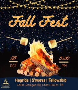 We would love for you to join us on October 25th at 5:30 PM for our Annual Fall Fest! We’ll be having chili, hotdogs, and marshmallows to roast over our bonfire, followed by a hayride. Bring your lawn chairs and favorite hotdogs for a night of fun and fellowship by the fire!